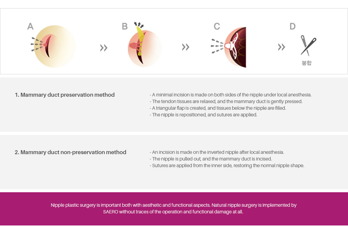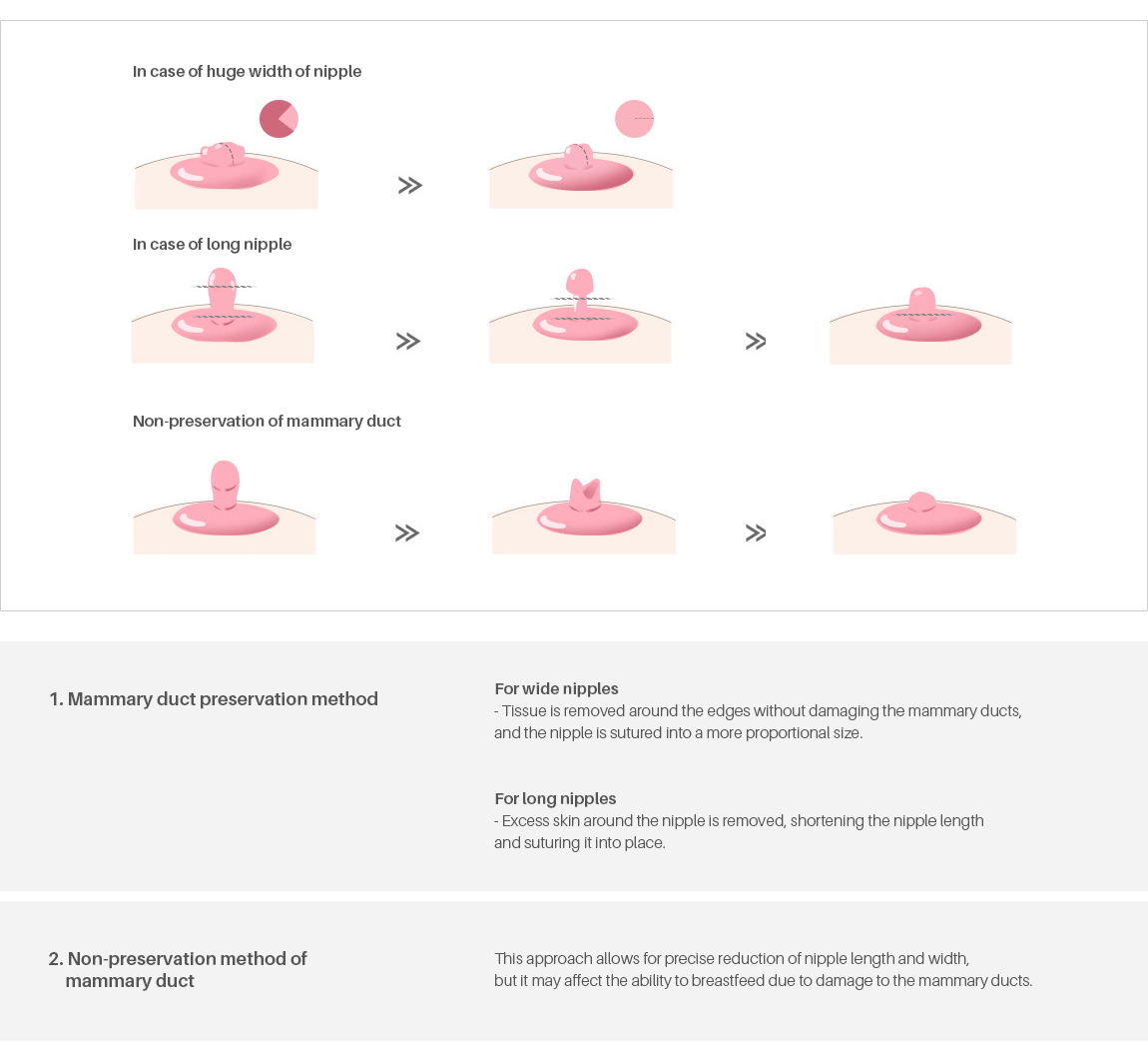 The procedure varies depending on nipple shape and whether the mammary duct is preserved.
